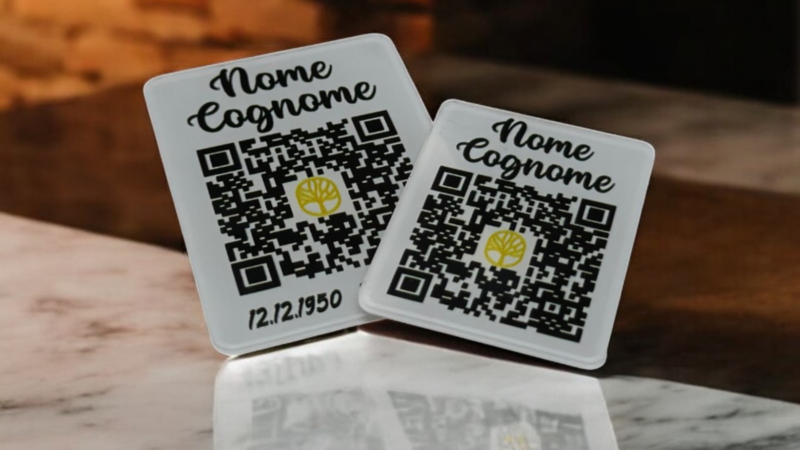 - Scegli la tua placchetta QR Code: Disponibile in diversi formati e colori, possiamo inserire anche il nome e il cognome.