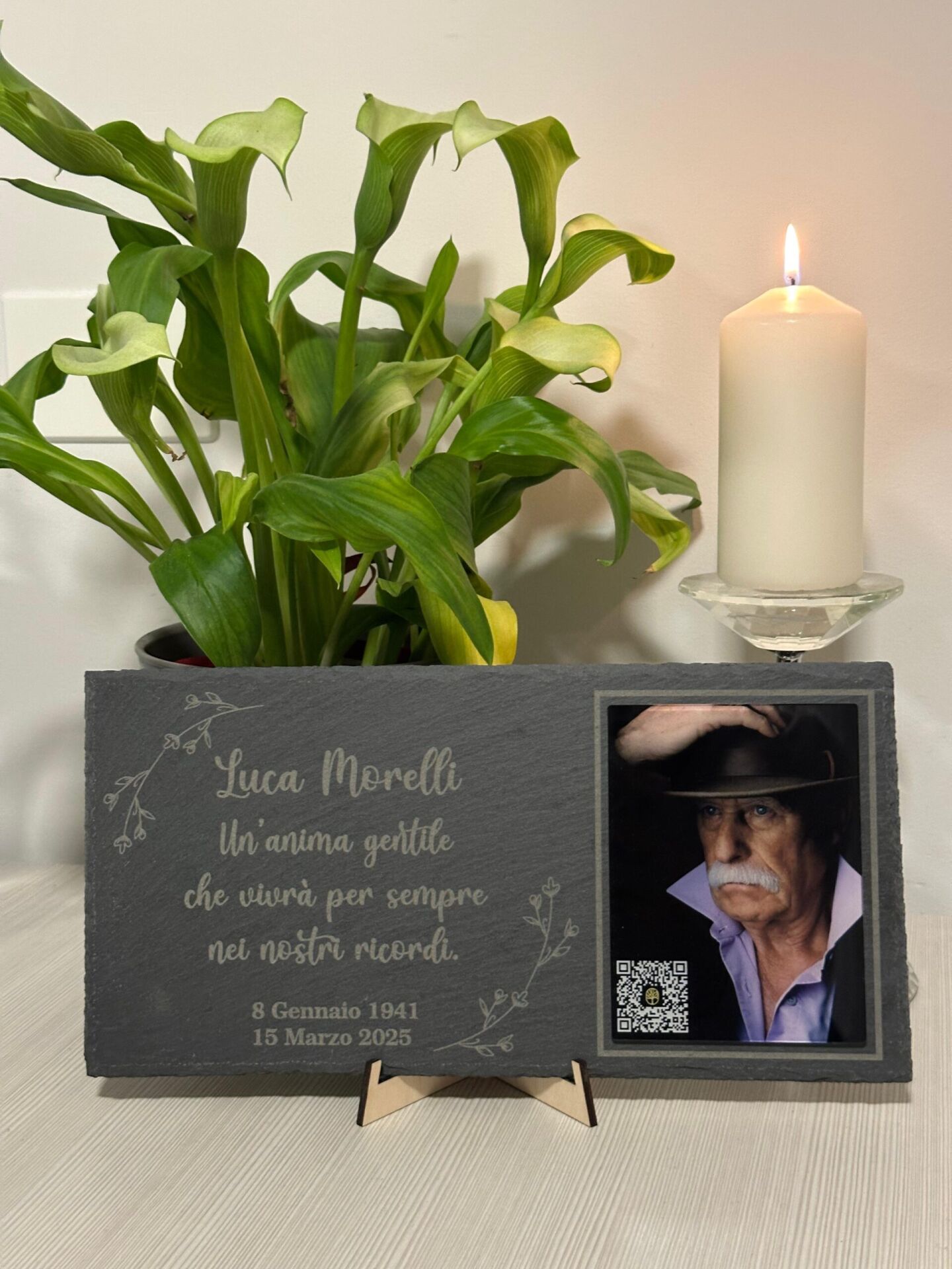 Ogni targa può includere nome, date, una frase significativa e se desideri , anche un QR code che si collega alla pagina digitale.